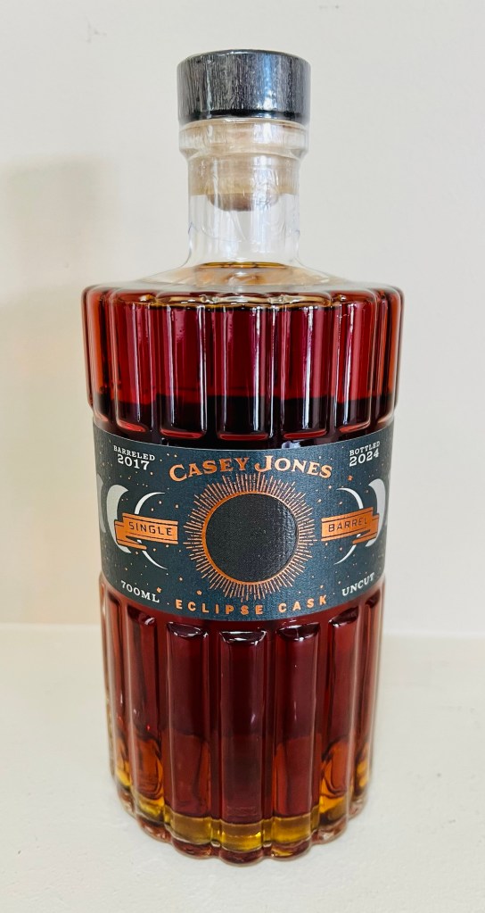 Casey Jones Single Barrel Eclipse Cask: Originally barreled for the 2017 Eclipse, it was now bottled for the 2024 Eclipse. The mashbill is 50% corn and 50% cane recipe. It was aged just shy of 7 years in a Kelvin Cooperage #4 char, medium toast cask, offered uncut at cask strength.