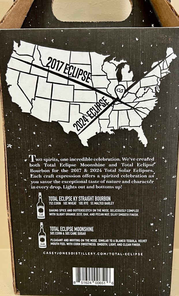 Total Eclipse Moonshine: Distilled from a century-old family recipe of 50% corn and 50% cane sugar, this particular moonshine was first created during the 2017 eclipse.