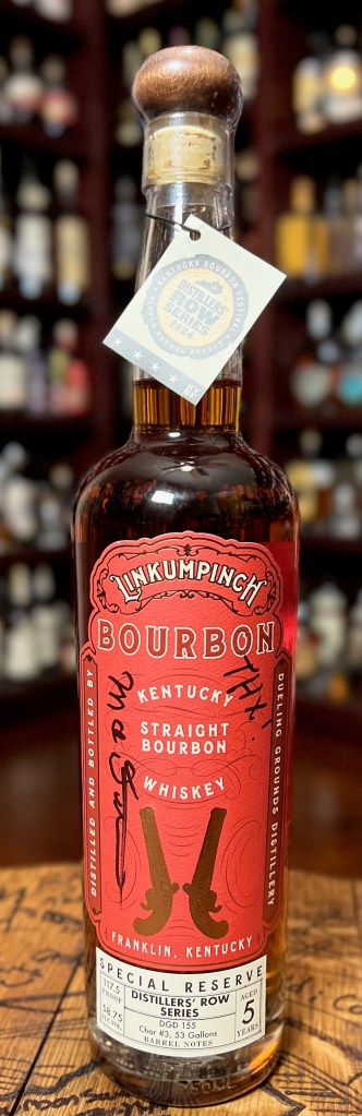 During the 2024 Kentucky Bourbon Festival, we acquired several exceptional bottles from the KBF Distillers’ Row Series. Among these, one bottle came from Dueling Grounds Distillery. Having visited them in Franklin, KY, we can unequivocally say that their regular offerings of the 4-Year-Old Linkumpinch Bourbon, whether in a cask strength single barrel version or a small batch of Bottle-in-Bond, are nothing short of outstanding.