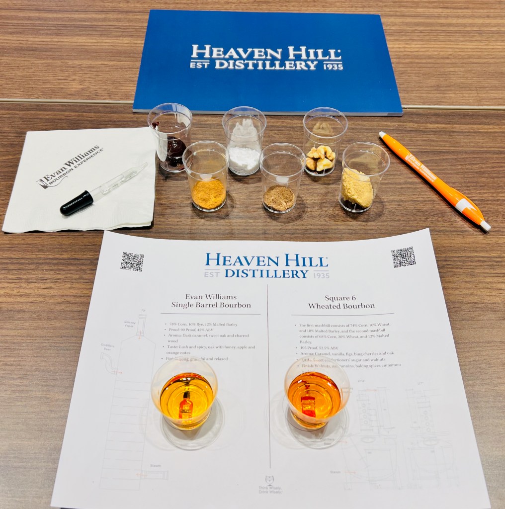 He then led us on a detailed tasting of two award-winning Evan Williams Bourbons made in distinctly different styles. The small cups, in the photo above, contained various elements, such as cherry, cinnamon, walnuts, etc. that might be on the nose or the palate of the two expressions. We were also provided a water dropper and were encouraged to try each a second time with a drop of water to see how it might open up differently.