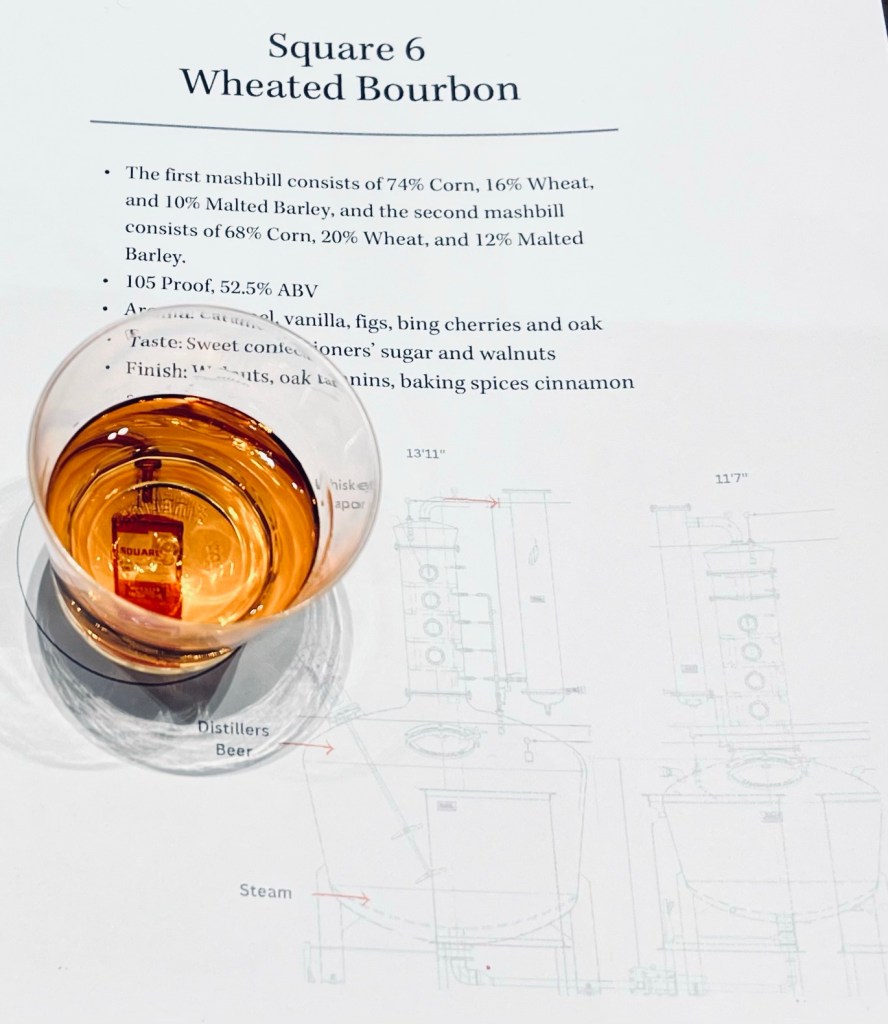 Next was the Square 6 wheated bourbon made in the EWBE Artisanal Distillery using Vendome pot stills. We have tried and purchased the Square 6 previously and the wheated expression is one of our favorites. It is a blend of two mashbills. The first is 74% corn, 16% wheat, and 10% malted barley. The second is 68% corn, 20% wheat, and 12% malted barley. This is bottled at 105 proof. All aspects of this is wonderful. The nose starts with caramel, vanilla, figs, cherries, and oak. The nose continues on the palate and adds confectioners’ sugar and walnuts. The walnuts continue on the finish as well as oak and cinnamon. It is a yummy flavor bomb.
